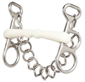 Stainless steel cheeks with a soft, non-toxic mouthpiece. The rein can be attached to either loop to exert more or less tongue pressure. This bit comes complete with a single link curb chain.