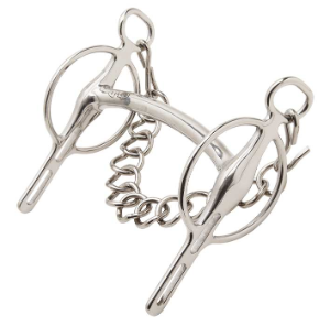 It has fixed cheeks to prevent pinching of the lips, and a single link curb chain. There are 2 slots in the shank to allow adjustment to the severity of rein action required.