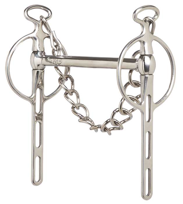 Liverpool bits are the most commonly used of the driving harness bits. This model has a reversible stainless steel straight mouth. Smooth on one side and ribbed on the other - for a sharper action on heavy mouthed horses. Comes complete with single link curb chain.