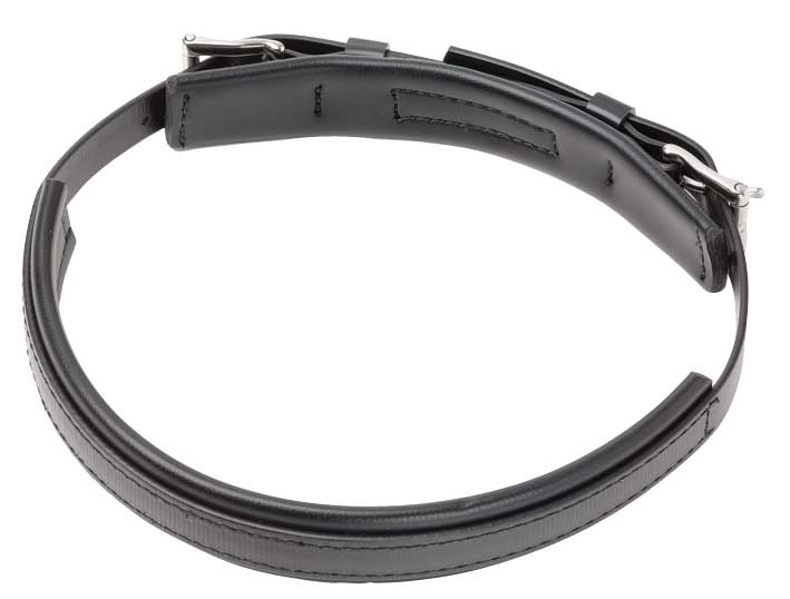 This is a cavesson style noseband that features double buckle adjustments and a chin pad. It is fitted by sliding it through the loops on the inside of the bridle cheeks.