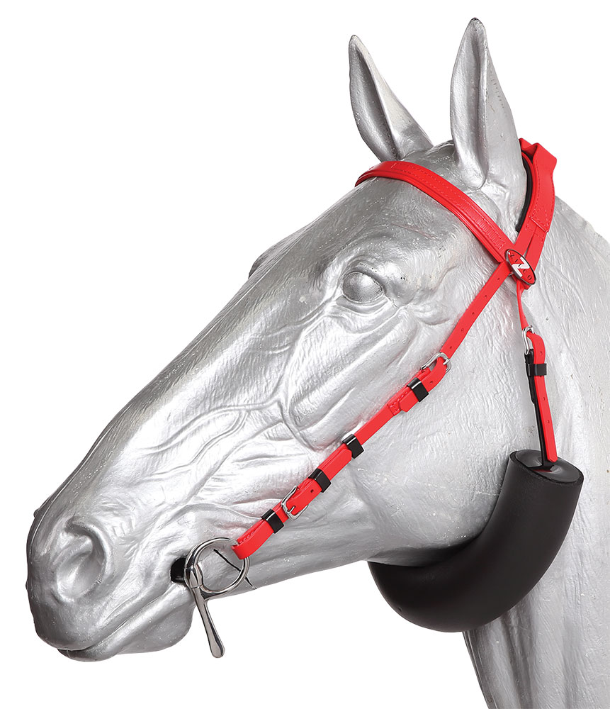 This device replaces the normal throat lash on the harness racing bridle and designed to prevent the horse from tucking his head in and choking down. By providing a more open head-set, the horse will have better airflow whilst racing.
